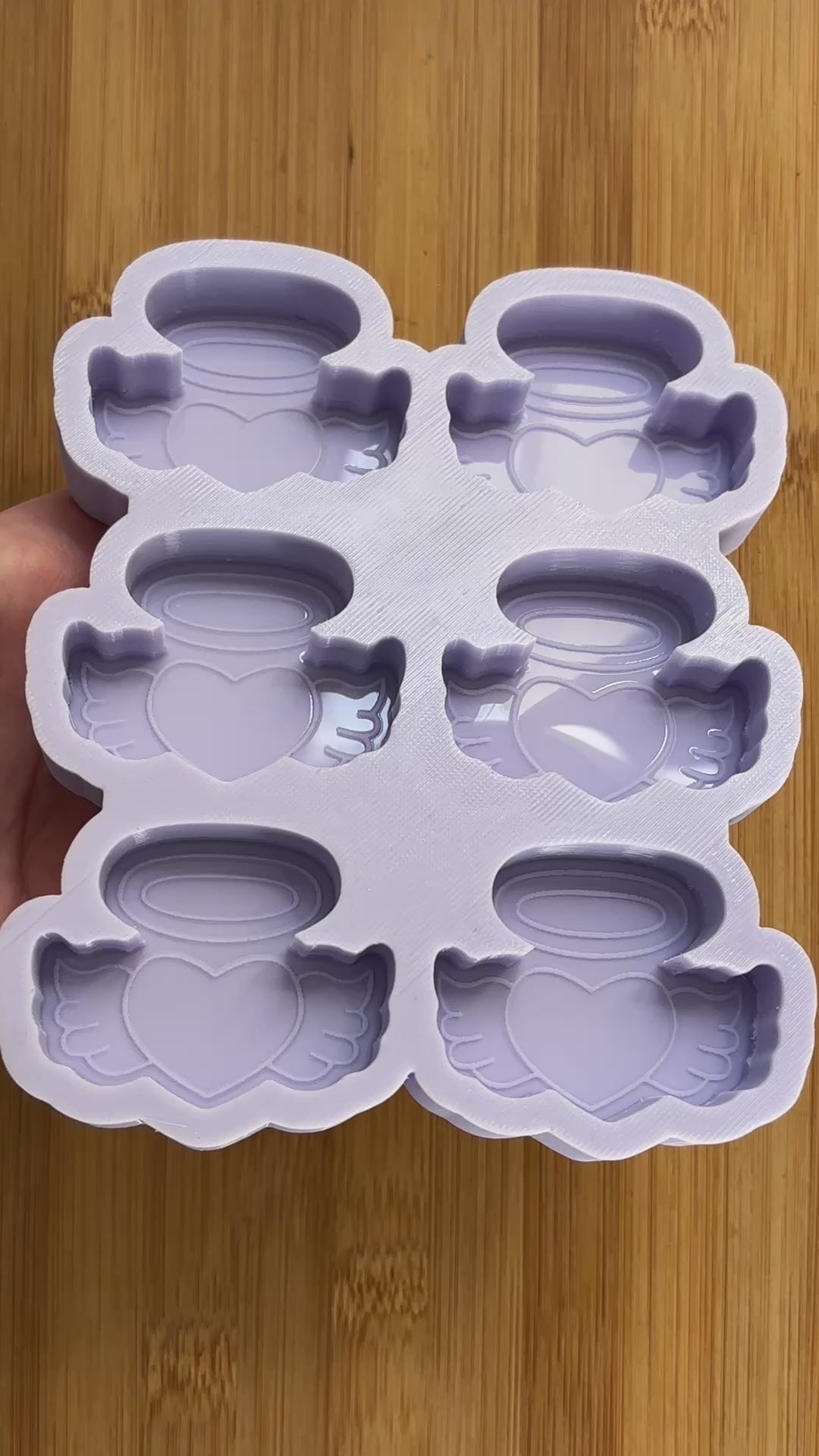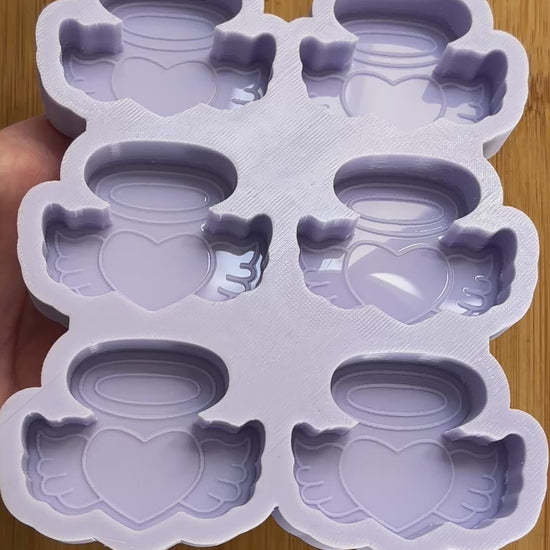Heart with Halo & Wings Silicone Mold with 6 cavities of 2 inches each, made with Food Safe Silicone suitable for both food and craft projects including resin, polymer clay, chocolate, soap embeds, candle wax, fondant, candy, jewelry making and so much more.